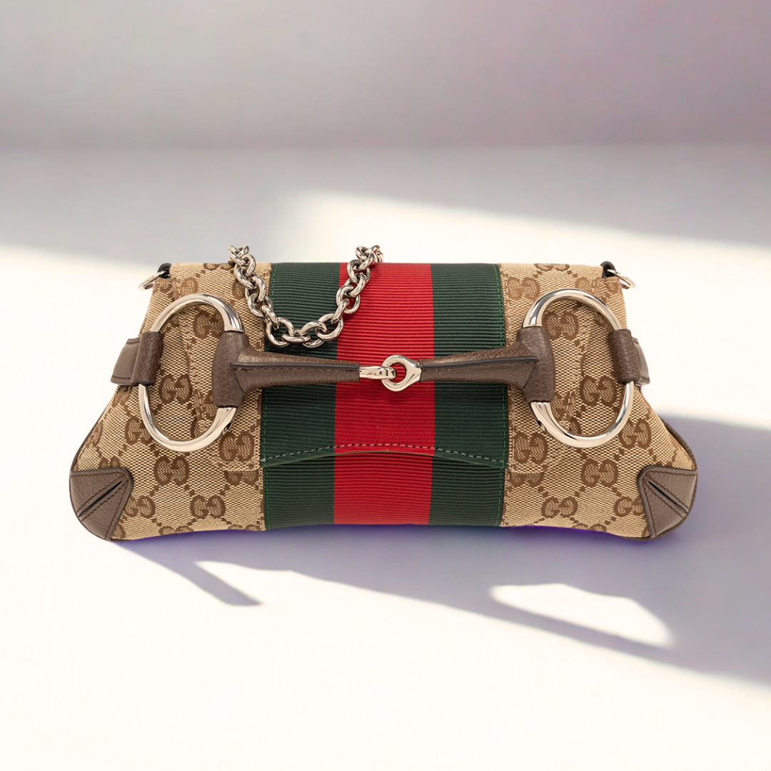 Le détail Horsebit est l’un des symboles les plus durables de Gucci, réinterprété depuis les années 1950. Ce modèle associe cuir brun souple, chaîne élégante et ornement Horsebit oversize, offrant une version moderne d’un héritage emblématique.