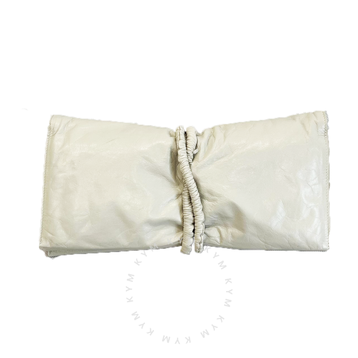 This elegant off-white clutch features a soft, supple exterior and a unique knotted rope-tie closure, offering a chic blend of refined elegance and laid-back charm. The streamlined design and neutral tone make it a stylish accessory for evening occasions or daytime events.