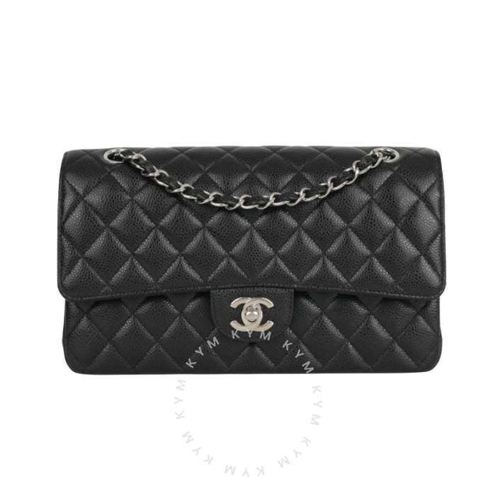 Elegant Chanel Classic Flap handbag crafted in black quilted caviar leather with silver-tone hardware. Features the iconic CC turn-lock closure and a leather-interwoven chain strap, allowing the bag to be worn on the shoulder or across the body. A refined and versatile design suited to both everyday wear and evening styling.